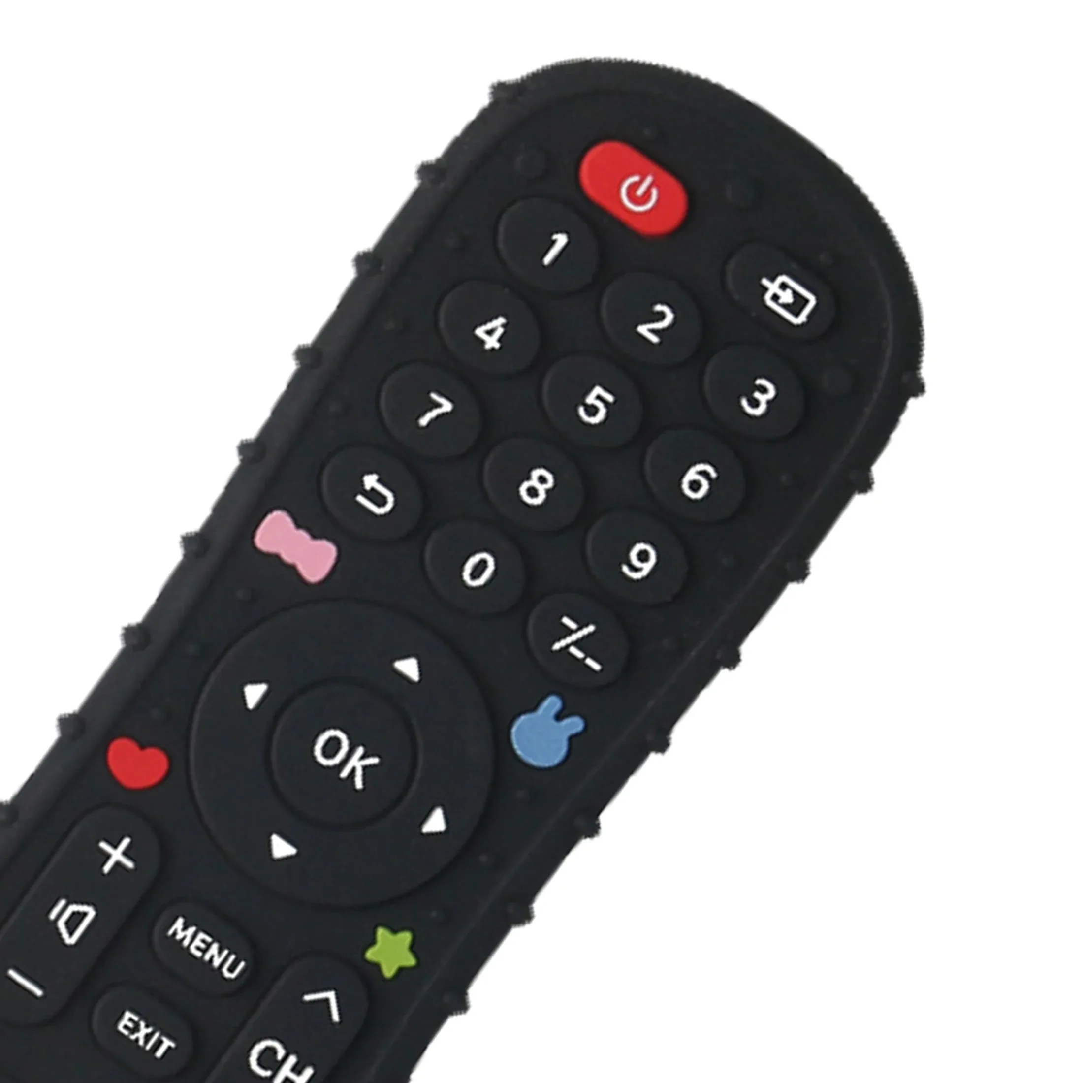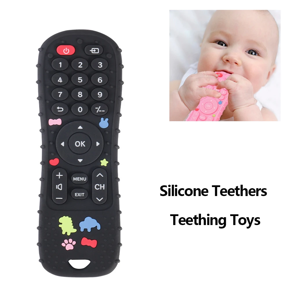 This silicone baby teether toy is designed in a fun TV remote shape that babies love.